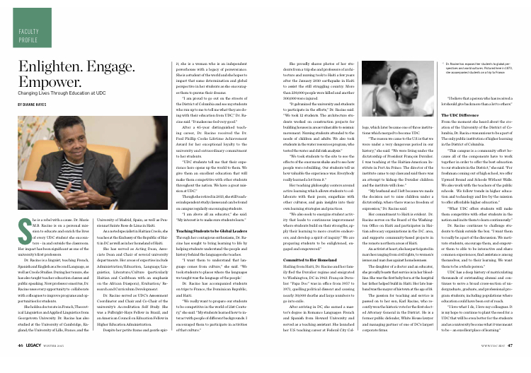 On July 23, 2020, Marie Racine, 86, a long-time District resident, passed away in Philadelphia, PA, surrounded by her children, Mikaele Racine and Karl Racine, and sister France Buteau. Born in Les Cayes, Haiti on May 31, 1934, Dr. Racine and her husband, Etzer Racine, immigrated to the United States in 1963. She earned a master’s and PhD in French and Linguistics from Howard University and Georgetown University, respectively, and embarked on an extraordinary 45-year career teaching generations of students at the University of the District of Columbia.